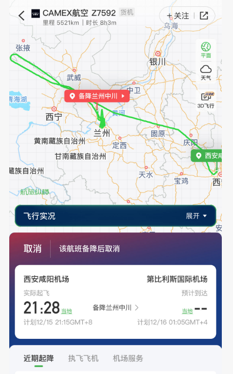 记者在航旅纵横查询发现,CAMEX航空Z7592货机原计划北京时间12月15日21:15从西安咸阳机场起飞,当地时间01:05达到第比利斯国际机场。实际该航班于北京时间21:28从西安咸阳机场起飞,12月16日2:47备降兰州中川国际机场。