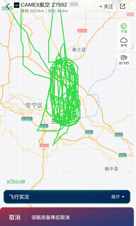 据航旅纵横,该航班自西安咸阳机场起飞后,一路向西北方向飞行,抵达张掖附近后,回返兰州,备降兰州中川国际机场。该航班备降期间在兰州市区上空盘旋多圈,航空轨迹因多次盘旋呈现一团乱麻状态。飞行实况显示,该航班飞行高度大部分在3000米到6000米之间。
